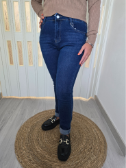 Jeans modello skinny, lavaggio blu scuro, con cuciture in oro.