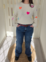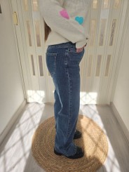 Jeans modello dritto gamba larga, vita alta, con tasche fronte e retro, cintura rossa removibile.