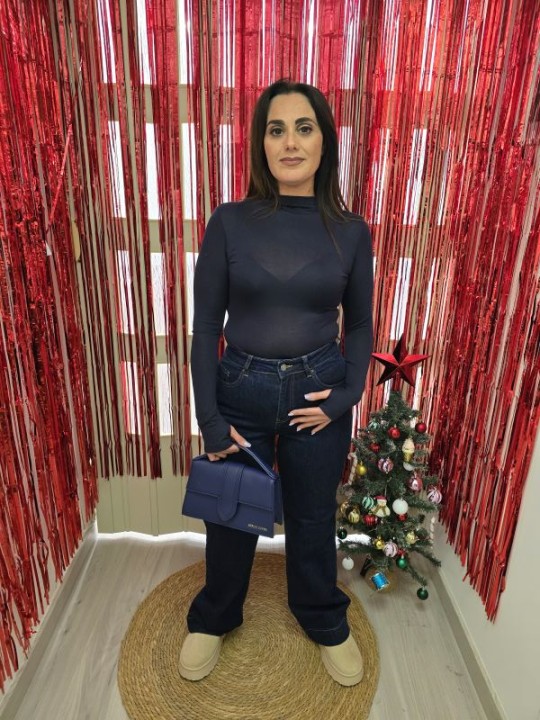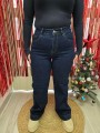 Jeans wide leg (gamba larga) lavaggio scuro, con cuciture in oro. Tasche fronte e retro.