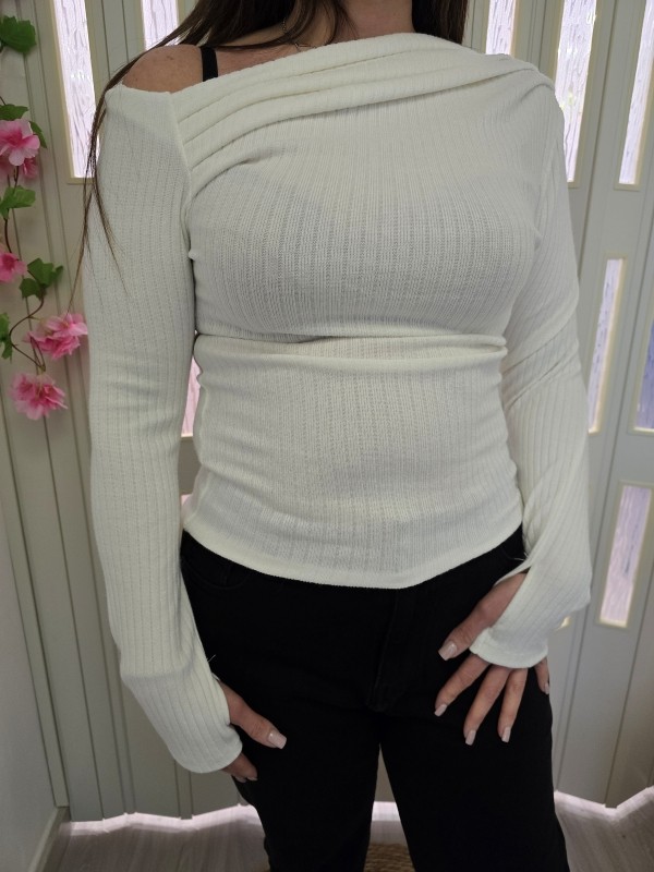 Maglia a costine con scollo asimmetrico arricciato, manica lunga con fori per pollici.