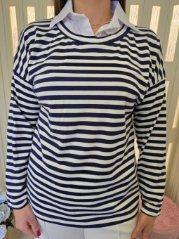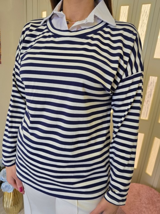 Maglia a righe manica lunga, con colletto camicia bianca.