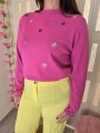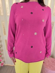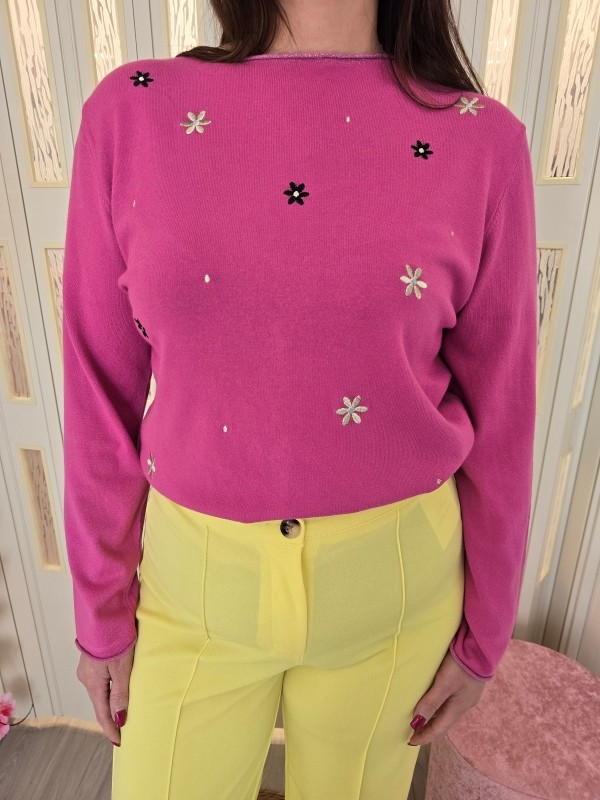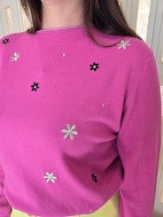 Maglia rosa, manica lunga, tessuto leggero, girocollo, con decorazioni fiorellini ricamati solo su lato fronte. Elasticizzata.