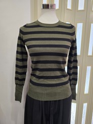 Maglia a costine, con righe nere, girocollo, con polsini stretti lunghi e con una piccola apertura, orlo finale spesso.
