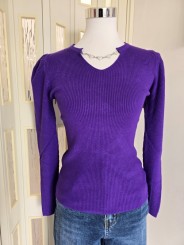Maglia a costine, manica lunga, con spalle a sbuffo, colletto a V con dettaglio cuoricini in argento.