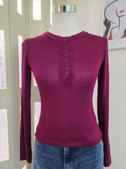 Maglia crop, girocollo, con bottoncini, manica lunga, semi trasparente.