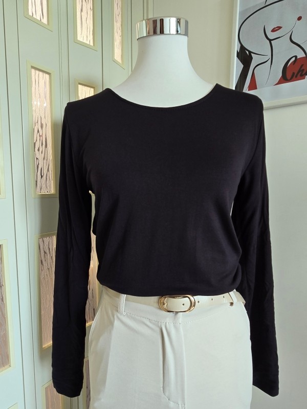Maglia scollo rotondo, manica lunga, orlo finale svasato, sul retro vi è una scollatura a V chiusa da un anello in metallo, elasticizzata.