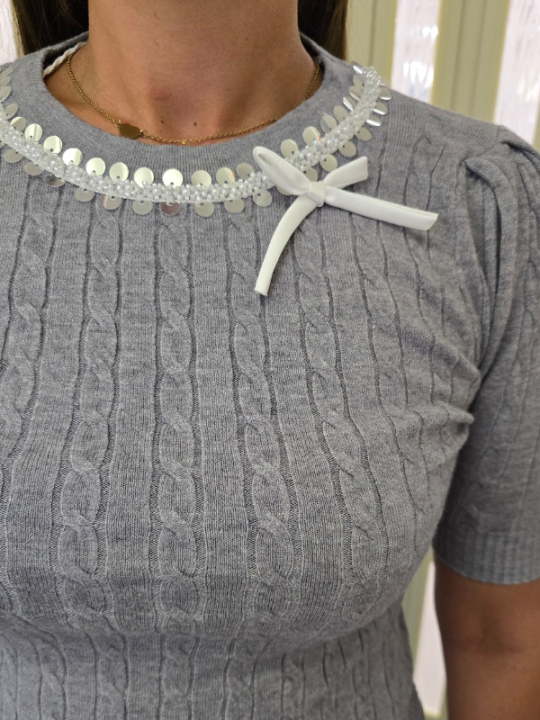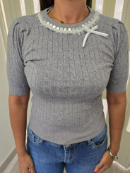 Maglia grigia mezza manica con motivo a treccia, elasticizzata.