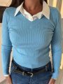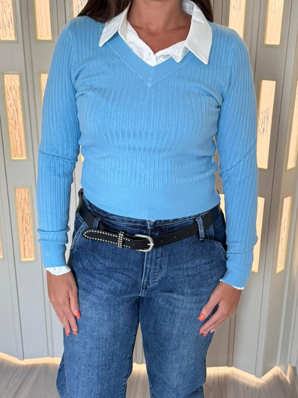 Maglioncino a costine azzurro, con scollo a V. Elasticizzato.