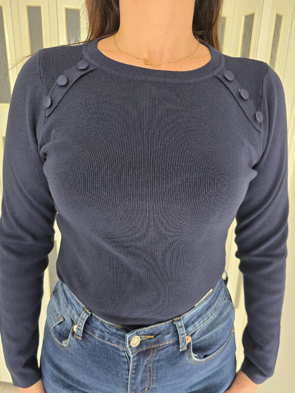 Maglia a costine con bottoni vicino al colletto, elasticizzata.