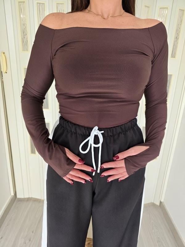 Maglia con scollo a barca, manica lunga, con fori per pollici.
