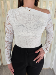 Maglia in pizzo con scollo asimmetrico, foderata sulla parte frontale, con schiena e maniche trasparenti.