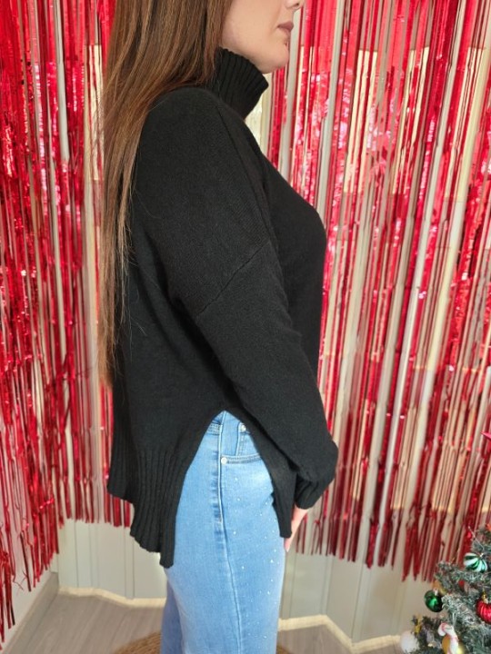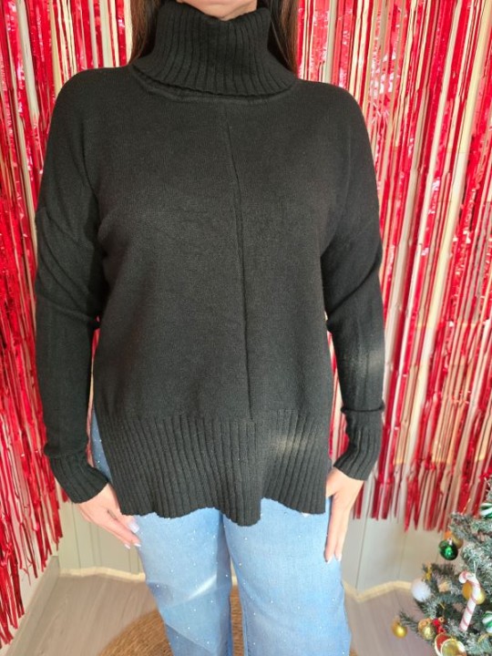 Maglia con colletto e polsini a costine, orlo finale a costine con spacchi laterali.