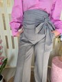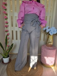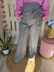 Pantaloni a palazzo, vita altissima con fascia sul busto e cintura annodabile laterale. Chiusura sul retro con zip.