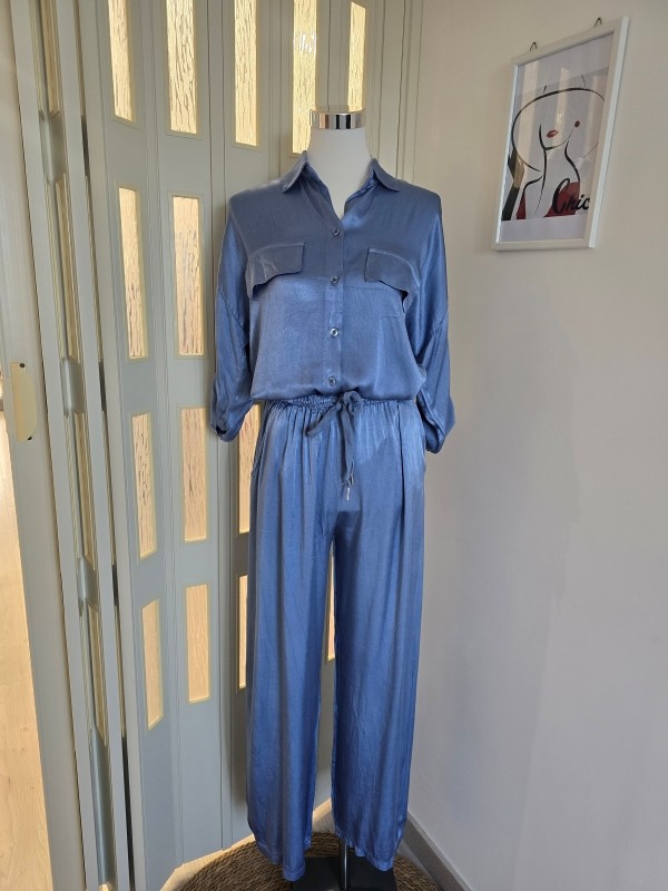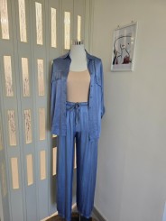 Pantalone a palazzo effetto raso, con tasche, elasticizzato in vita, con chiusura laccio.