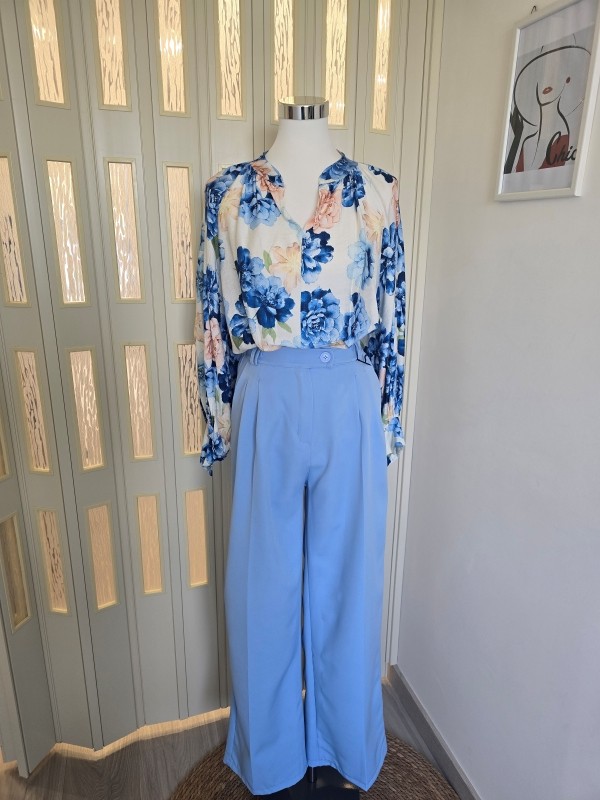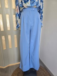 Pantalone azzurro a palazzo con elastico in vita sul retro, tasche, chiusura con bottone e zip.