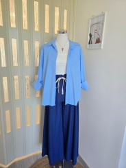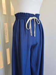 Pantalone in varie colorazioni, tessuto simil lino, con tasche, e coulisse regolabile. Elasticizzato in vita.