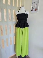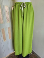 Pantalone a palazzo, con coulisse in vita e orli finali regolabili.