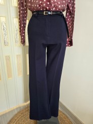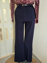 Pantalone a zampa blu scuro, chiusura bottone con zip, tasche solo lato fronte + cintura con fibbia in oro removibile.