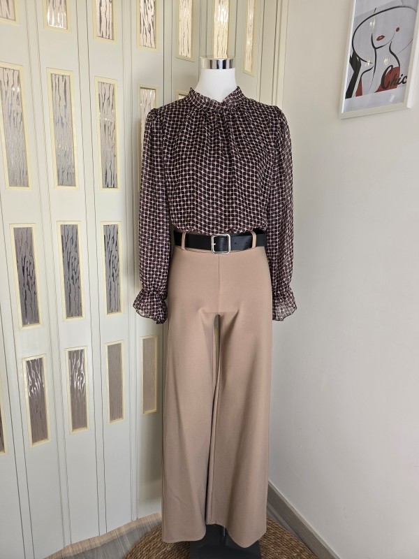 Pantalone invernale a palazzo, vita alta, elasticizzato in vita, con passanti e cintura nera removibile.