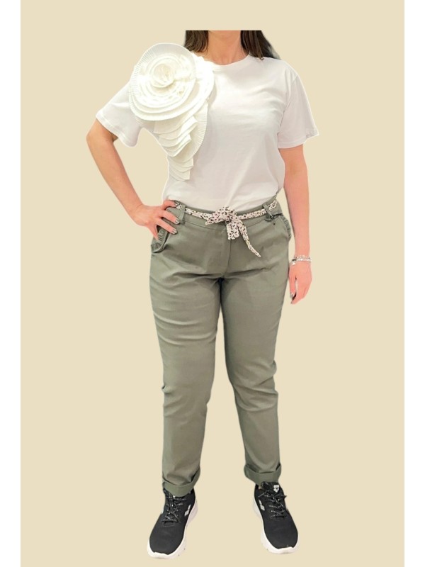 Pantalone elastico con tasche con dettaglio volant e cintura leopardata 77% viscosa 20% poliammide 3% elastan.