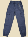 Pantalone elasticizzato con molla in vita, catena e tasche laterali.