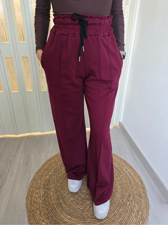 Tuta elasticizzata in vita con laccio, modello a palazzo.