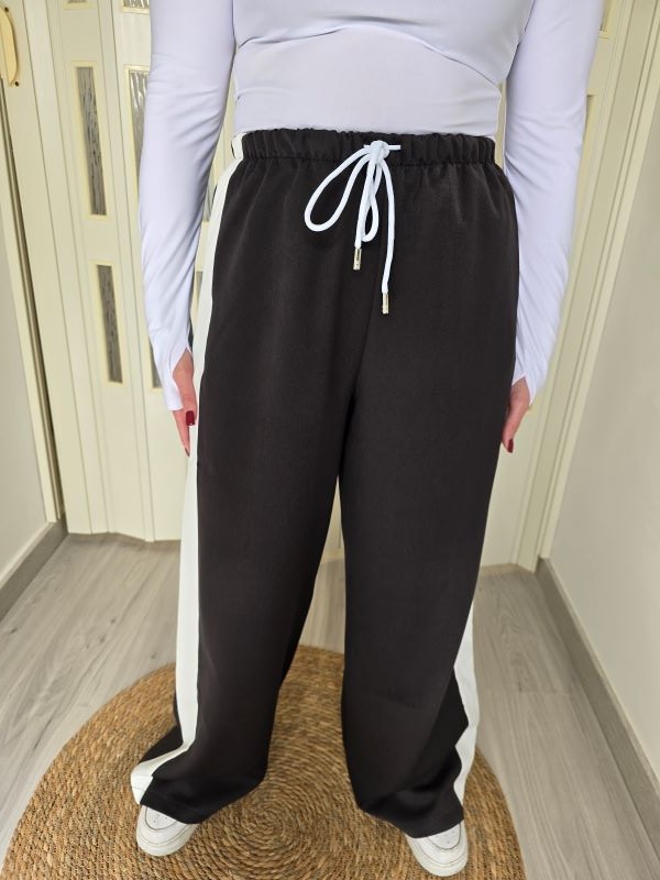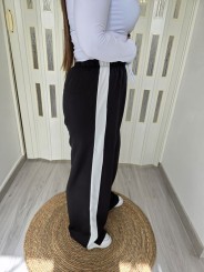 Pantalone nero elasticizzato, regolabile con laccio bianco, con strisce bianche laterali.