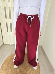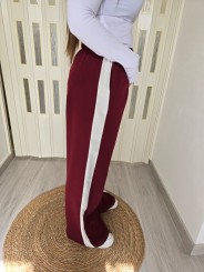Pantalone bordeaux elasticizzato, regolabile con laccio bianco, con strisce bianche laterali.