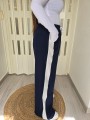 Pantalone blu elasticizzato, regolabile con laccio bianco, con strisce bianche laterali.