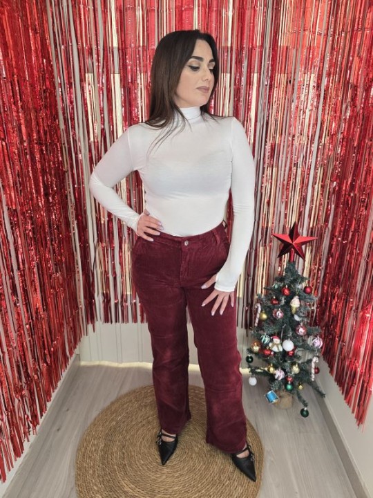 Pantalone vita alta bordeaux in velluto a coste modello wide leg (gamba larga).