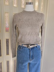 Maglione color tortora a costine, maniche lunghe, mezzo collo a coste più doppio, presenta vari tipi di decorazioni, con polsini lunghi e stretti a coste doppie, orlo finale alto e fasciante a coste doppie.