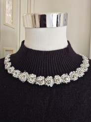 Pullover lana rasata, a collo alto a costine decorato con collana fiorellini con perline e strass solo su lato fronte,