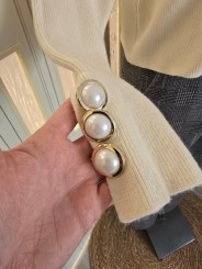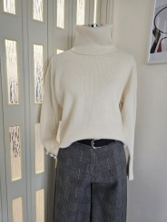 Pullover a costine, modello crop, collo alto, manica lunga con polsini lunghi e stretti con 3 bottoni in perle con rifinitura in oro.