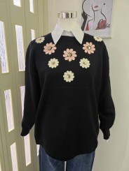 Pullover oversize con girocollo a costine, manica lunga con polsino stretto a costine, decorato con fiori colorati solo sul lato anteriore.