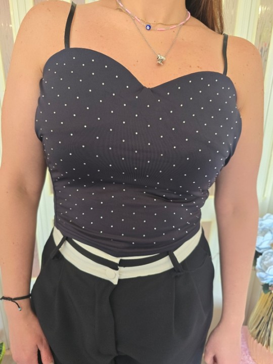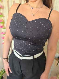 Top corto ricoperto di strass solo avanti, con bretelle regolabili, scollo a cuore, coppe imbottite.