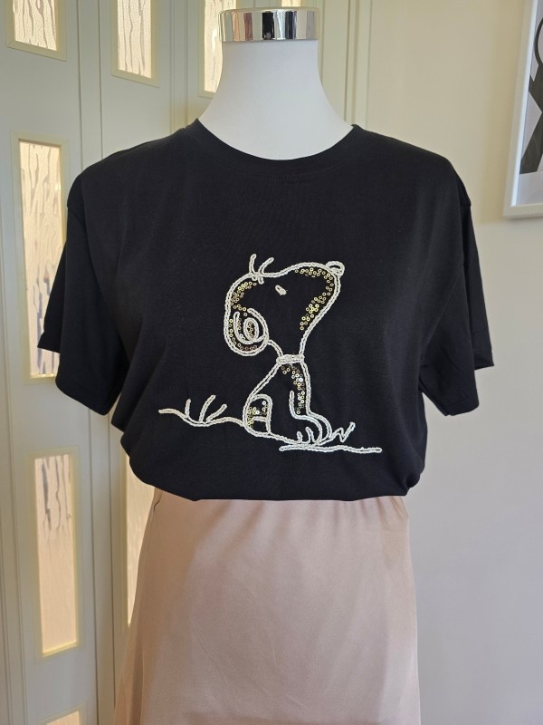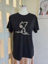 T-shirt nera, girocollo, con snoopy. Elasticizzata.