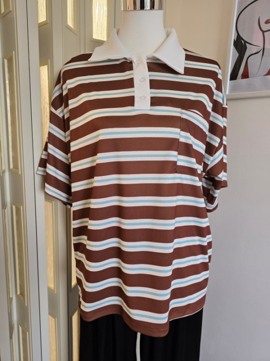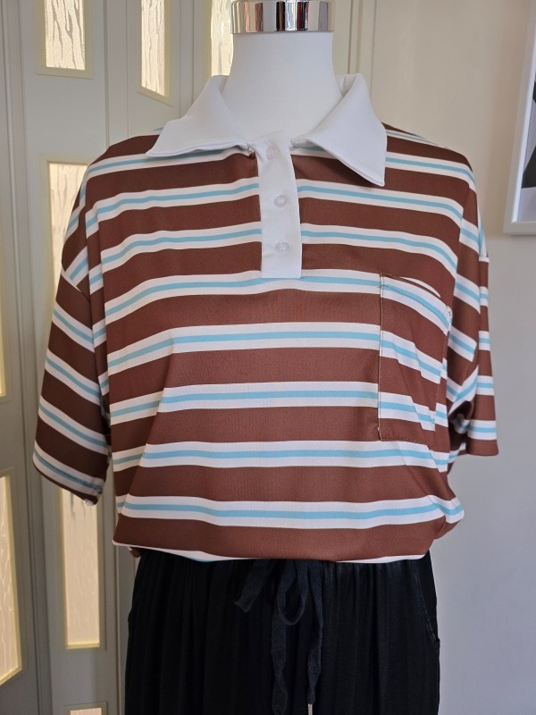 T-shirt stile polo, mezza manica, a righe colorate, con colletto con 3 bottoni, 1 taschino.