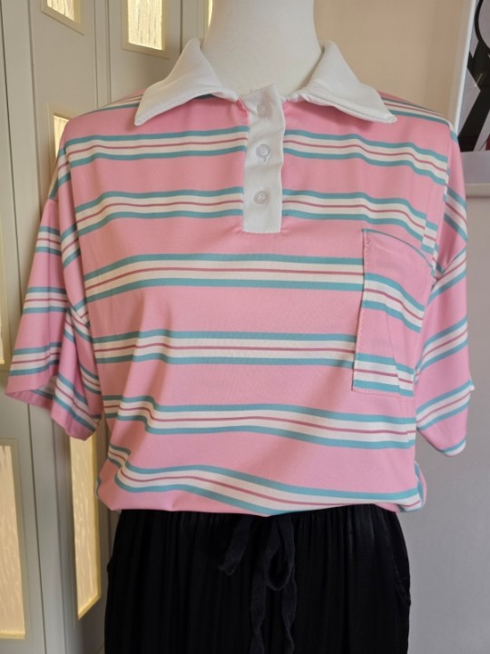 T-shirt stile polo, mezza manica, a righe colorate, con colletto con 3 bottoni, 1 taschino.