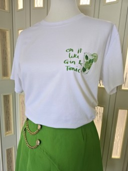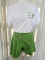 T-shirt bianca, girocollo, con scritta verde. Elasticizzata.