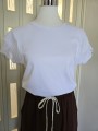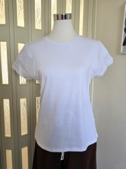 T-shirt bianca, girocollo, con balze in san gallo. Elasticizzata.