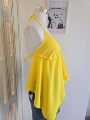Top con scollatura a V, con orlo volant sui laterali, con coppette preformate regolabili, annodabile sul collo e sul retro.
