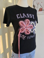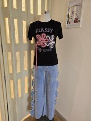 T-shirt con scritta e decorazione di fiori con lacci.