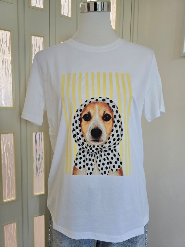 T-shirt bianca con stampa cane con righe, girocollo, elasticizzata.