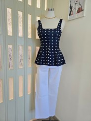 Top blu navy a pois bianchi, con scollatura quadrata e spalline larghe NON regolabili, corpetto aderente che si allarga sui fianchi.