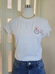 T-shirt bianca, girocollo, decorazione su un lato di una bicicletta ricamata.