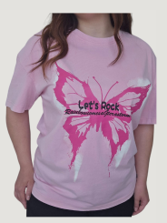 T-Shirt rosa con scritte e farfalla al centro. Veste da una XS (38 ita) ad una XXL (48 ita).