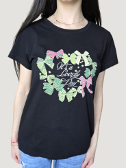 T-Shirt in 6 colorazioni, con fantasia fiocchi, strass e scritta al centro.