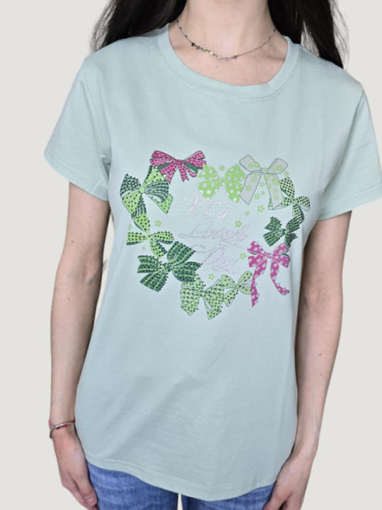 T-Shirt in 5 colorazioni, con fantasia fiocchi, strass e scritta al centro.